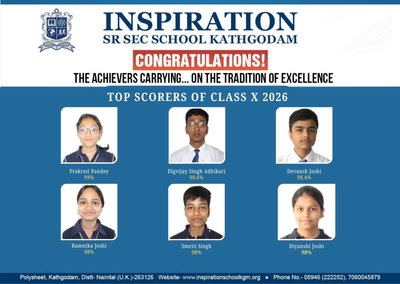 सी0बी0एस0ई0 के घोषित परिणामों इंस्पिरेशन पब्लिक स्कूल का दबदबा 10 वीं कक्षा प्रशंसनीय रहा जिसमें कक्षा 10वीं में 163 विद्यार्थी सम्मिलित हुए। 72 विद्यार्थियों ने 90 प्रतिशत से अधिक अंक प्राप्त किए। प्रकृति पाण्डे ने 99 प्रतिशत, दिगविजय सिंह अधिकारी ने 98.6 प्रतिशत एवं देवांश जोशी ने 98.4 प्रतिशत अंक हासिल किए। ज्ञात हो कि 36 विद्यार्थियों द्वारा आई0 टी0 में, 13 विद्यार्थियों ने अंग्रेजी में, 01 विद्यार्थी ने हिन्दी में एवं 01 विद्यार्थी ने सामाजिक विज्ञान में शत-प्रतिशत अंक प्राप्त किए।