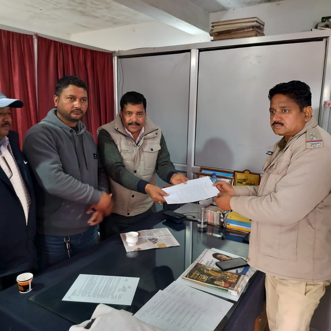 फोटो – पाटी थाना अध्यक्ष को तहरीर सौंपते विधायक खुशाल सिंह अधिकारी।